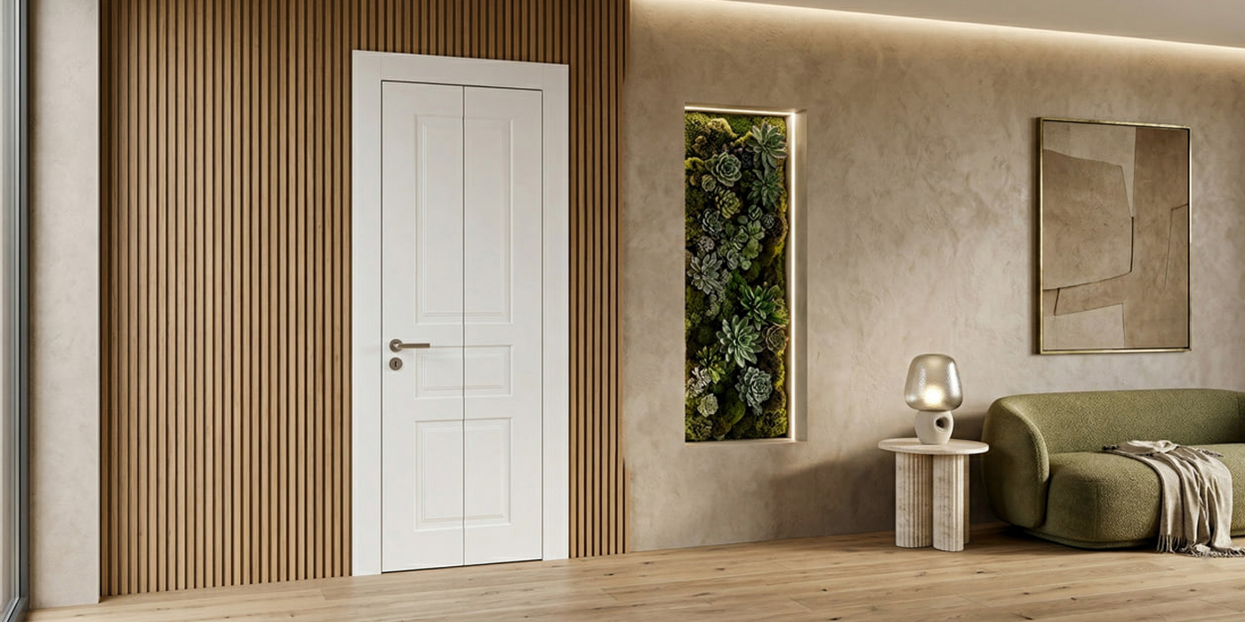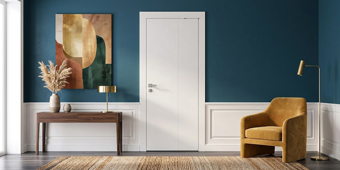 В закрытом положении дверь выглядит как цельное полотно и визуально практически не отличается от обычной модели. Аккуратный вертикальный шов между частями делает конструкцию лаконичной и гармонично вписывает её в интерьер.