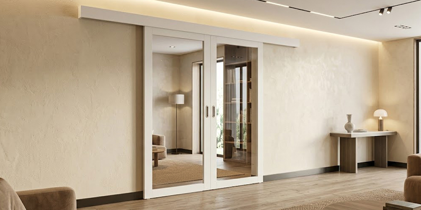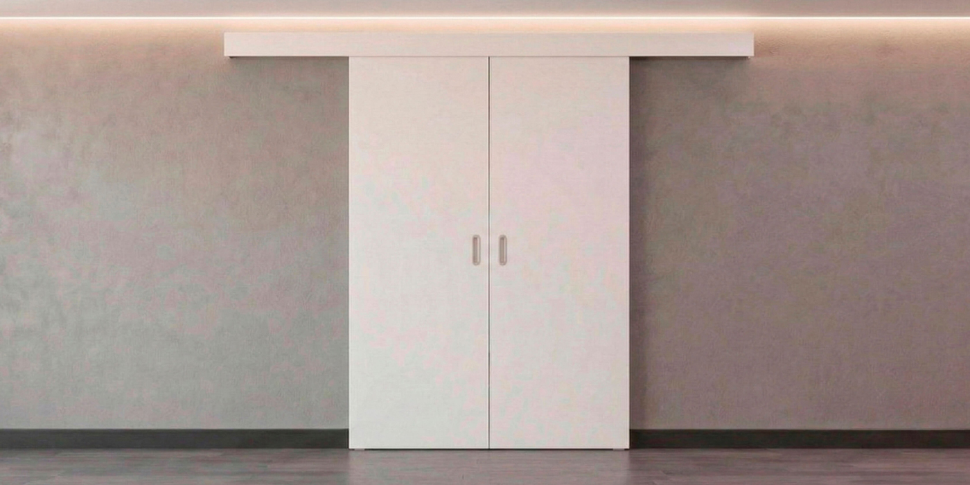 Раздвижные двухстворчатые двери — это система, при которой два полотна перемещаются по направляющей вдоль стены в разные стороны. Такое решение позволяет перекрывать широкие проёмы и при этом экономить пространство по сравнению с распашными дверями.